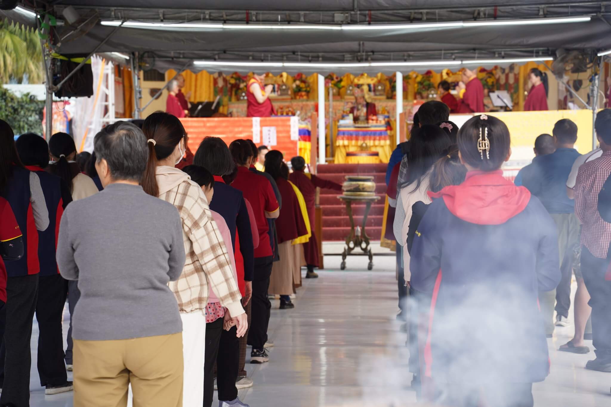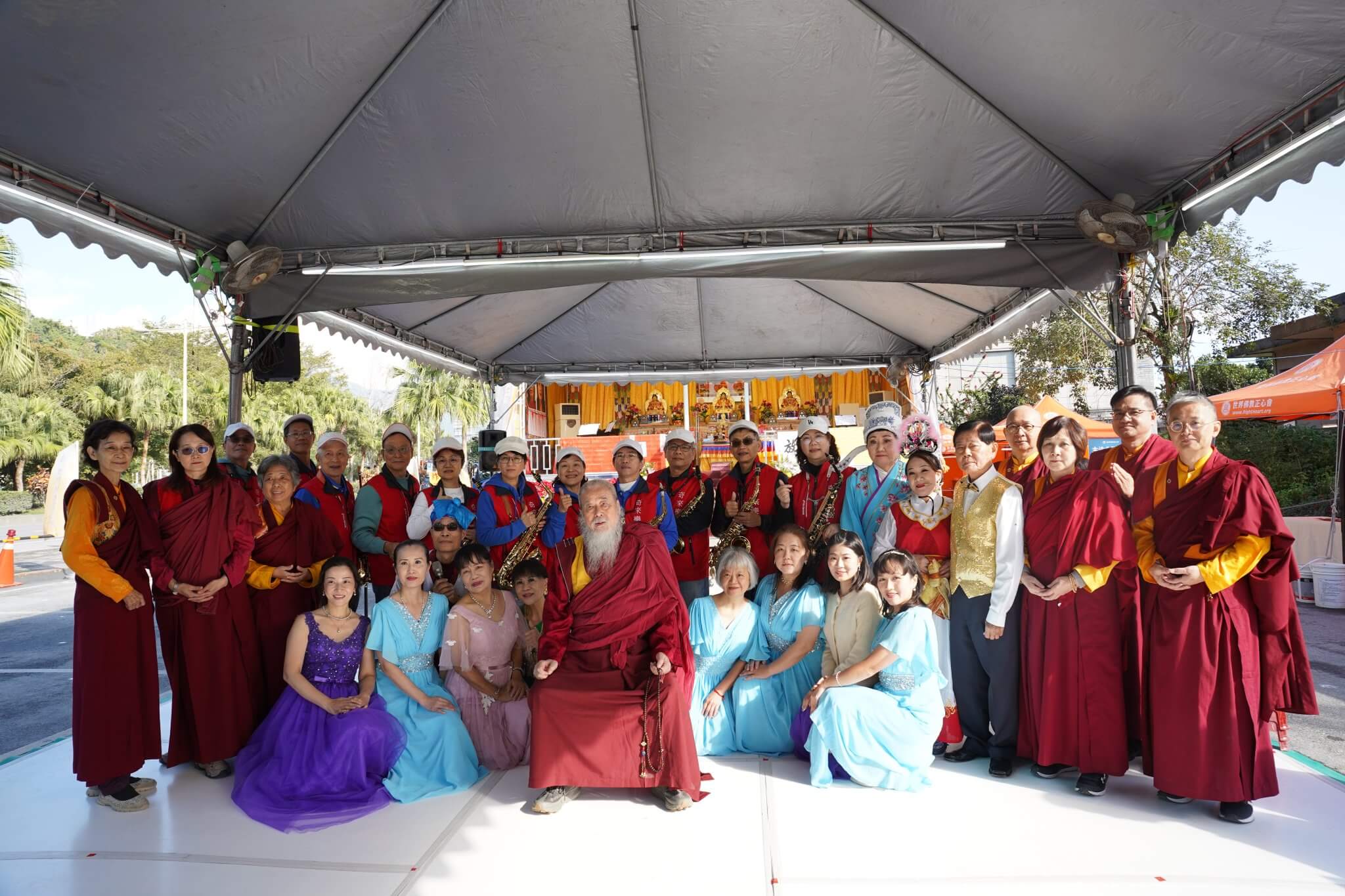 三天法會中來自各地信眾、當地居民參加誦經法會,藉由誦經的功德力,佛菩薩的威神之力,加持迴向受災的六道眾生,更有一位林先生在水災中失去雙親到現在音訊全無!雖本人是教徒但也誠心祈求諸佛菩薩盡快找到雙親下落!三天法會感謝天韻薩克斯風樂團、沐木舞蹈藝術空間、芊音弦樂團、三腳貓薩克斯風樂團、奇來樂團、元極舞、陳盈融音樂老師等不辭辛勞來到光復樂藝供佛,以優美的音樂、舞蹈演出撫慰人心!呼籲大眾學習南無第三世多杰羌佛教法,有正確的知見,才能真正了知法義,諸惡莫作,眾善奉行。